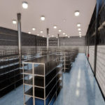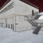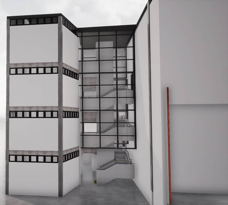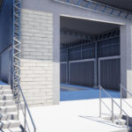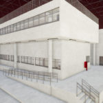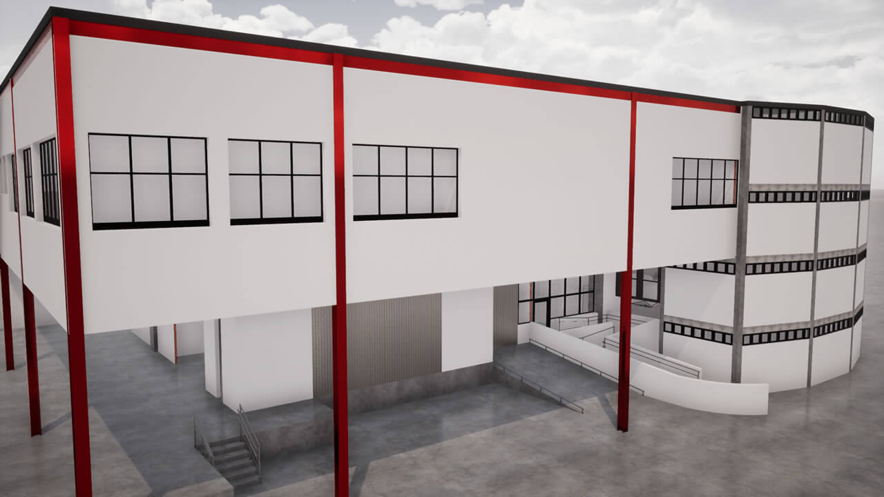 O projeto para ampliação da área de Almoxarifado e Armazenagem, seguindo a mesma tipologia do bloco existente. O projeto conta com estrutura em concreto, com pintura acrílica sobre bloco de concreto aparente, rampa externa para acesso PCD, e circulação vertical através de escada metálica e novo elevador; no mezanino, foi proposto um depósito para armazenagem de pequenos itens.