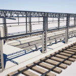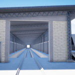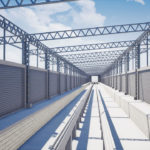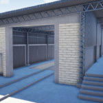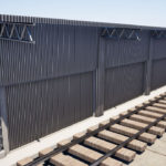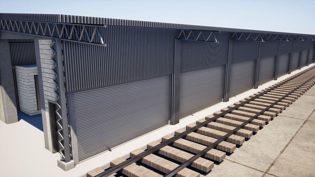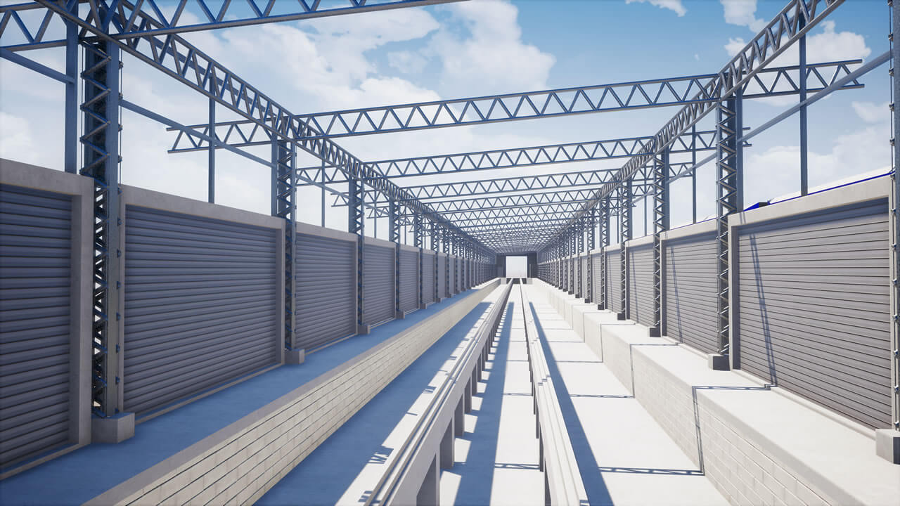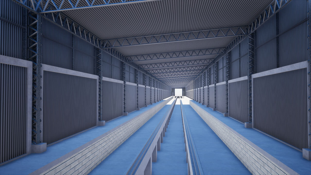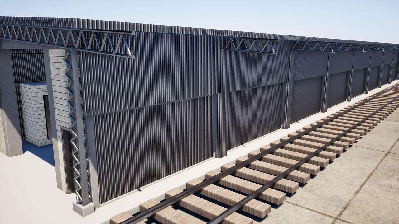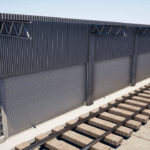 Fechamento de galpão destinado à limpeza técnica de remoção de poeira de trens com aplicação chapas metálicas fixadas com parafuso e fita de vedação nos pórticos de concreto existente, vedando totalmente o galpão.
