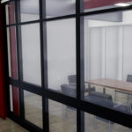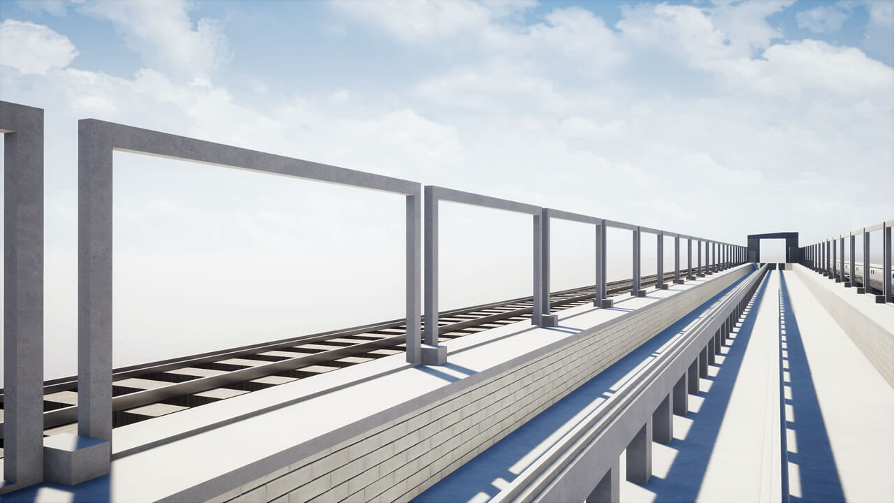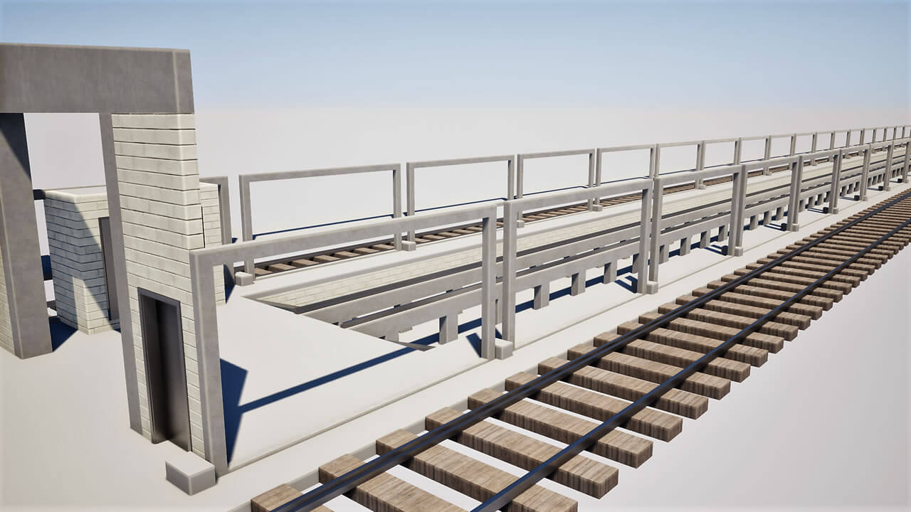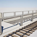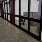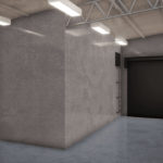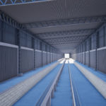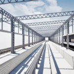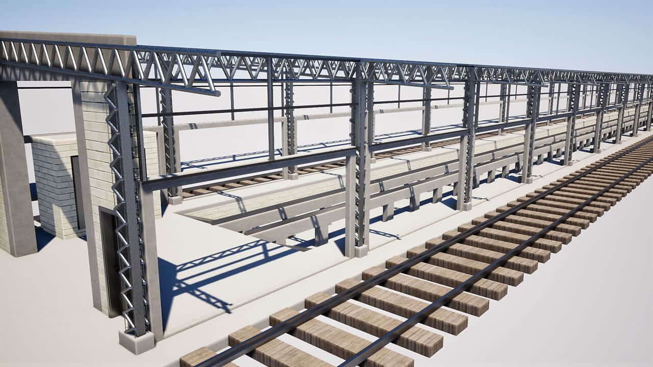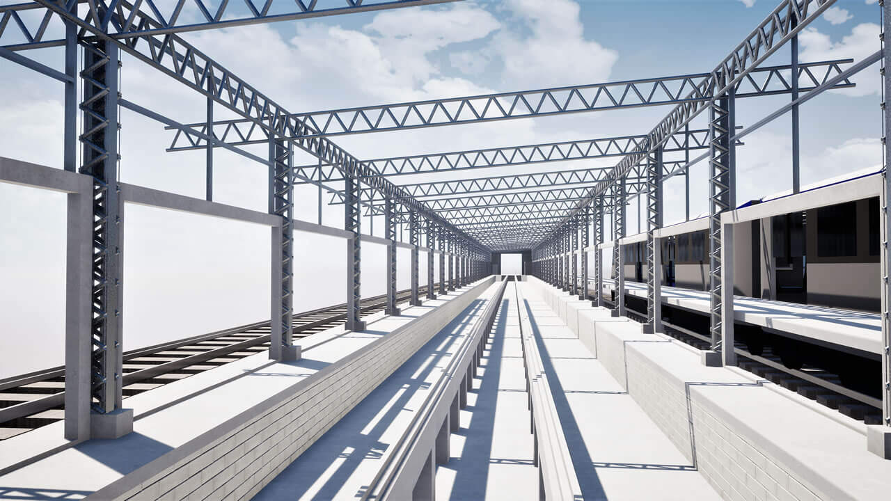 Fechamento de galpão destinado à limpeza técnica de remoção de poeira de trens com aplicação chapas metálicas fixadas com parafuso e fita de vedação nos pórticos de concreto existente, vedando totalmente o galpão.